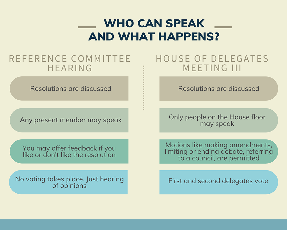 The following resolutions will be discussed during the 2026 House of Delegates. Review these graphics for help about when and how to speak on these resolutions.